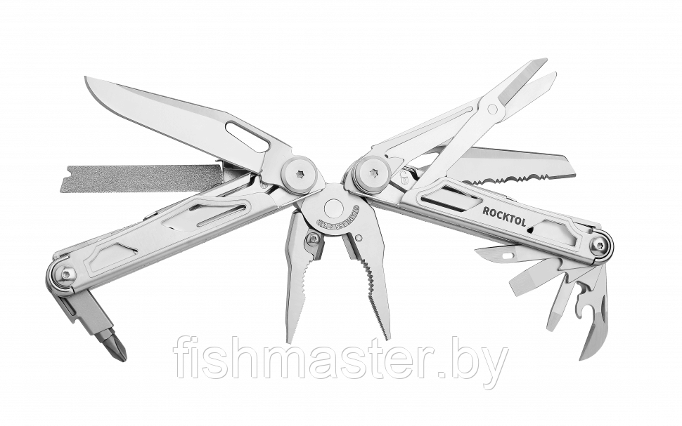 Этот многофункциональный инструмент включает в себя 29 инструментов, включая обычные плоскогубцы, плоскогубцы с игольчатым наконечником, сменные кусачки, устройства для снятия проволоки, прямые и зазубренные ножи, сменную пилу по дереву, напильник по дереву / металлу, большие пружинящие ножницы, шило, открывалки для бутылок и банок, отвертки с прорезями и отвертки для стаканов, сменную насадку с 8 наборами двухсторонних бит (SP8 + SP4, TT25 + TT20 , TT15+TT10, SL6 +SL5, SL4 +SL3, H5 +H4, H3 +H2.5, PH2+PH1). Все инструменты оснащены предохранителями для уверенного использования.